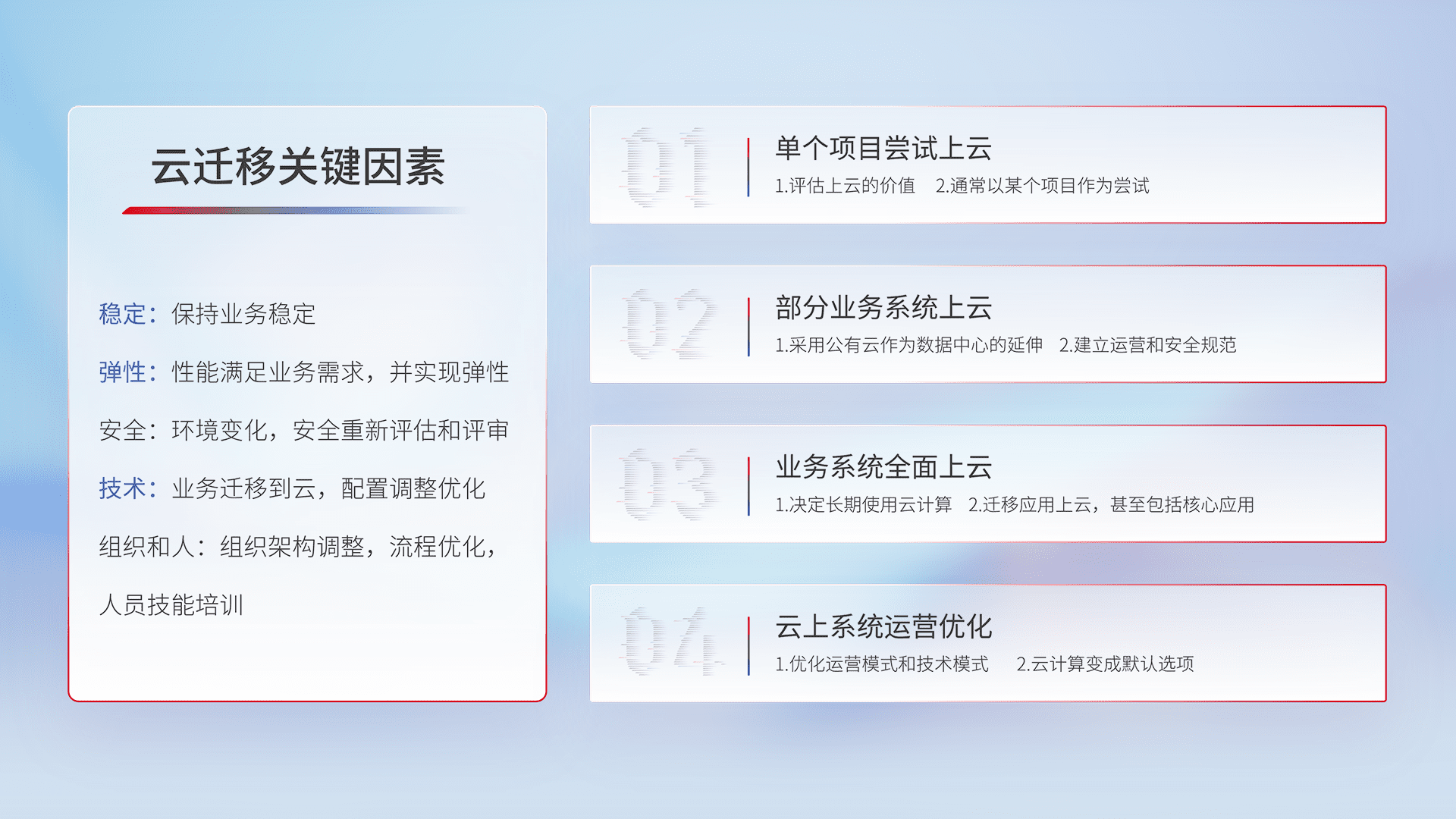 结合实际业务,,,从规划设计、、云平台选型、、、、云原生改造、、数据迁移、、集成交付,,,迁移全过程为客户识别最佳上云路径,,,做好风险识别管理,,,,设计网络架构、、、、身份权限、、安全审计合规、、操作审计、、、、日志审计、、监控告警策略、、多站点容灾设计等,,对云上基础设施进行整体规划,,,,提升IT治理水平,,,以满足弹性、、、高可用、、、高性能的需求。。