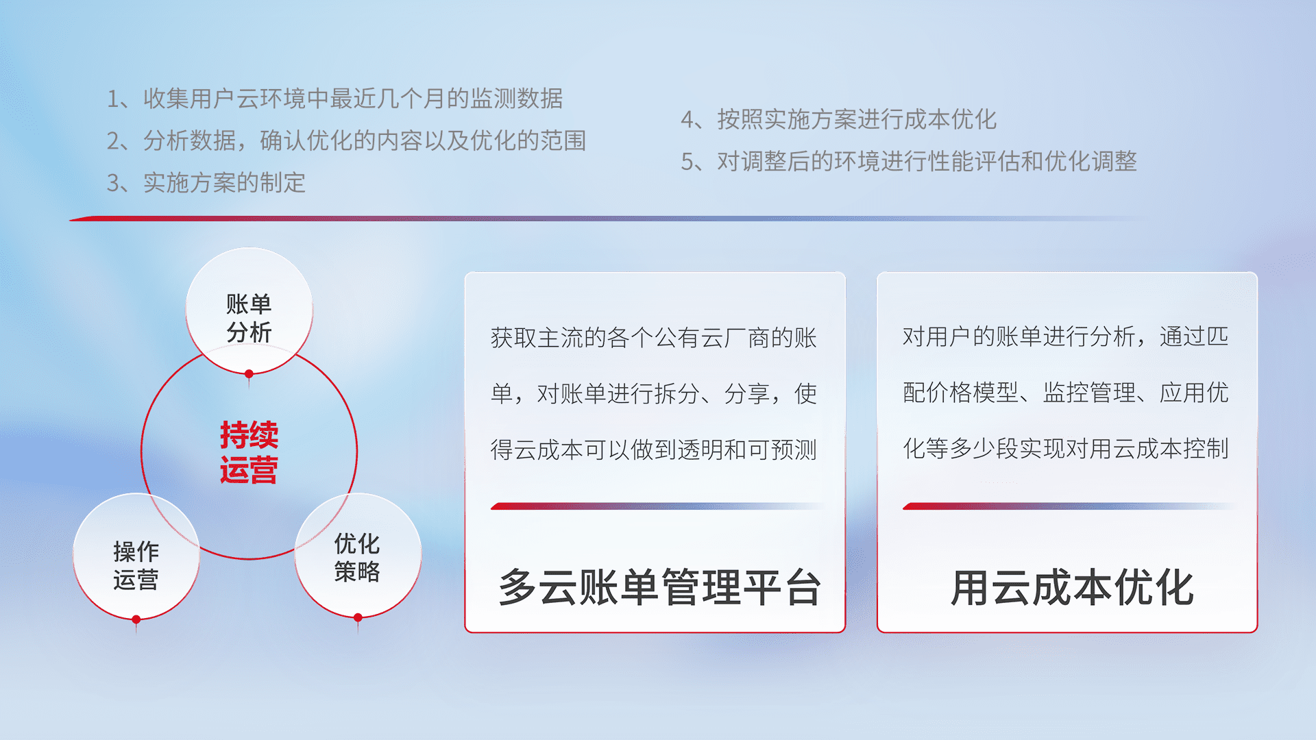 通过多云纳管,,,以统一的资源数据模型把客户的云资源进行抽象和封装,,,进而实现对多云资源的统一操作,,,保障云资源管理的可靠性、、、、稳定性与可用性。。量身定制化运维内容,,,,配置、、、开发运维、、、、补丁管理、、、、备份、、监控、、、认证和访问管理、、、审计和日常巡检等,,保障在用云过程中的可靠度,,稳定度以及高可用率。。。
